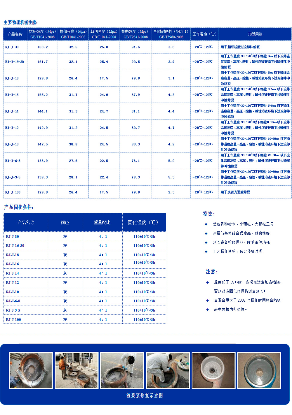 RJ-中温系列耐磨材料双组分,以陶瓷、金属碳化物、微型颗粒为骨材的耐磨复合材料,具有耐水、耐油、耐酸碱性,与基体结合强度高。用于使用温度(-60℃~120℃)超细粒度的磨料磨损或冲蚀磨损设备的修复,如灰浆泵、水泵、风机、水轮机、蜗壳、管道类、泵类等修复(典型用途见主要物理机械性能表)。
